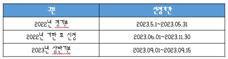 5월 1일부터 5월 31 일일까지 한 달 동안 진행되며, 한 달 내 신청을 못했다고 하더라도 금년 11월 30일까지 2022년분에 대해 기한 후 신청이 가능하다.