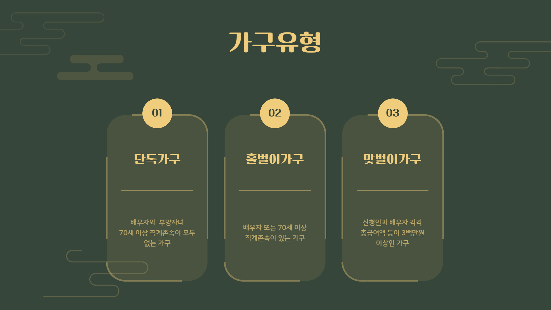 1) 가구유형별 요건 2)총소득요건 3) 재산요건에 부합해야 한다.
